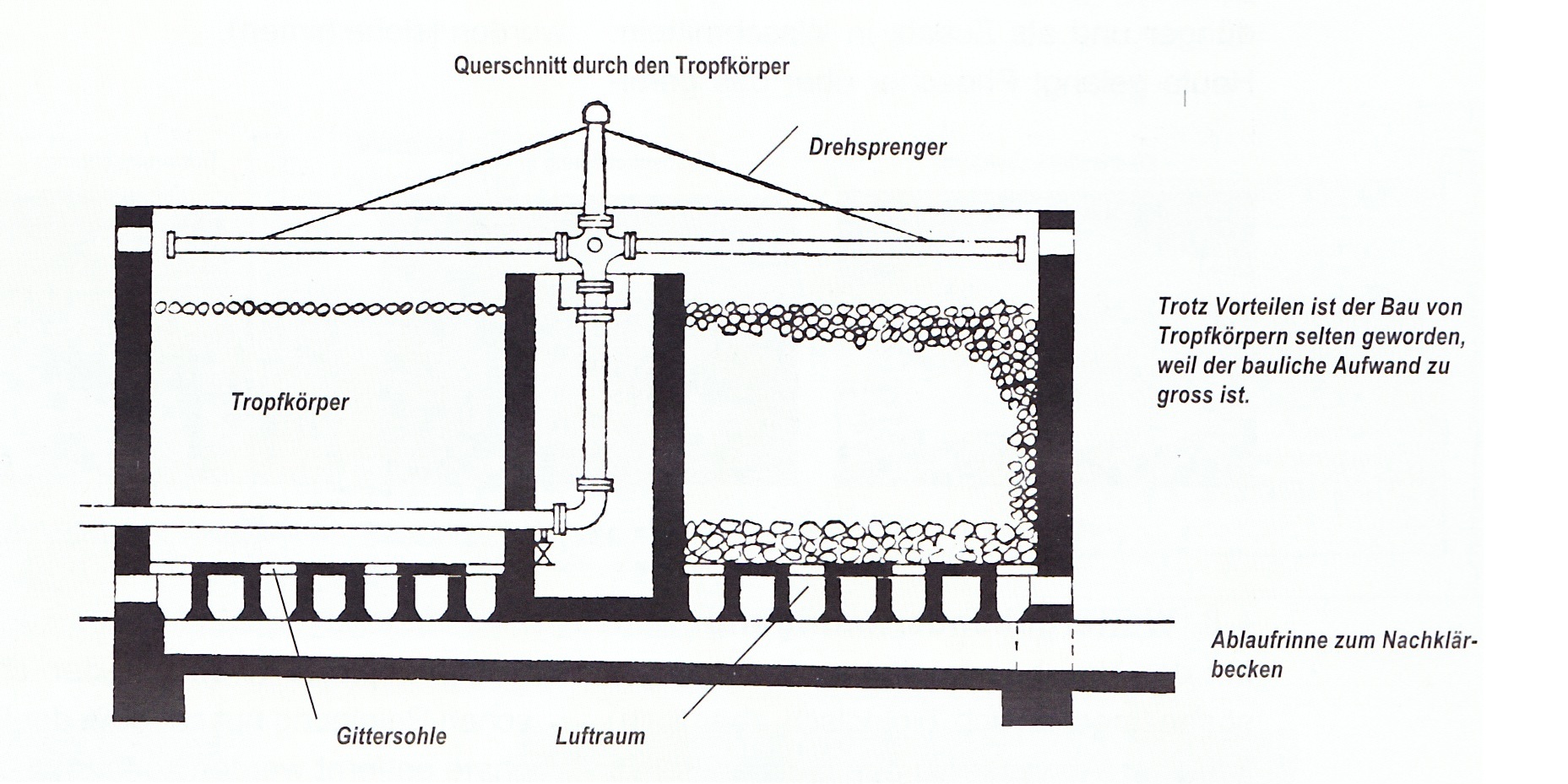 Der Tropfkörper ist ein zylindrisches, mit Steinen unterschiedlicher Korngrössen gefülltes Becken. Das Abwasser wird über die Steine verrieselt, an denen die Bakterien als so genannter biologischer Rasen haften bleiben.